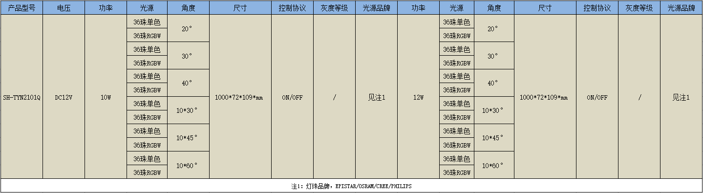 產(chǎn)品型號: SH-TYN2101Q 電 壓: DC12V 功 率: 10W/12W 光 色: 黃光、暖光、白光、中性光 光 源: 3030、3535、5050 光源品牌: 晶元、 歐司朗、科銳、飛利浦 材 質(zhì): 鋁材 工作溫度: -20℃~40℃ 防護等級: IP65 應(yīng)用環(huán)境: 室外 光 束 角: 20°、30°、40°、10*30°、10*45°、10*60° 燈具尺寸: 見提供型號 控制協(xié)議: ON/OFF 壽 命: 50,000h